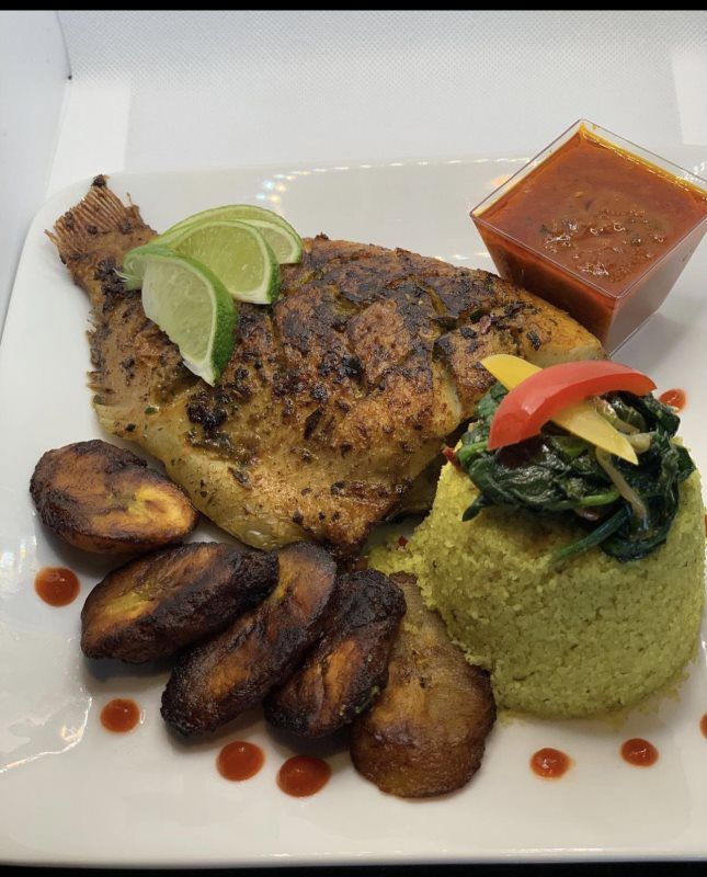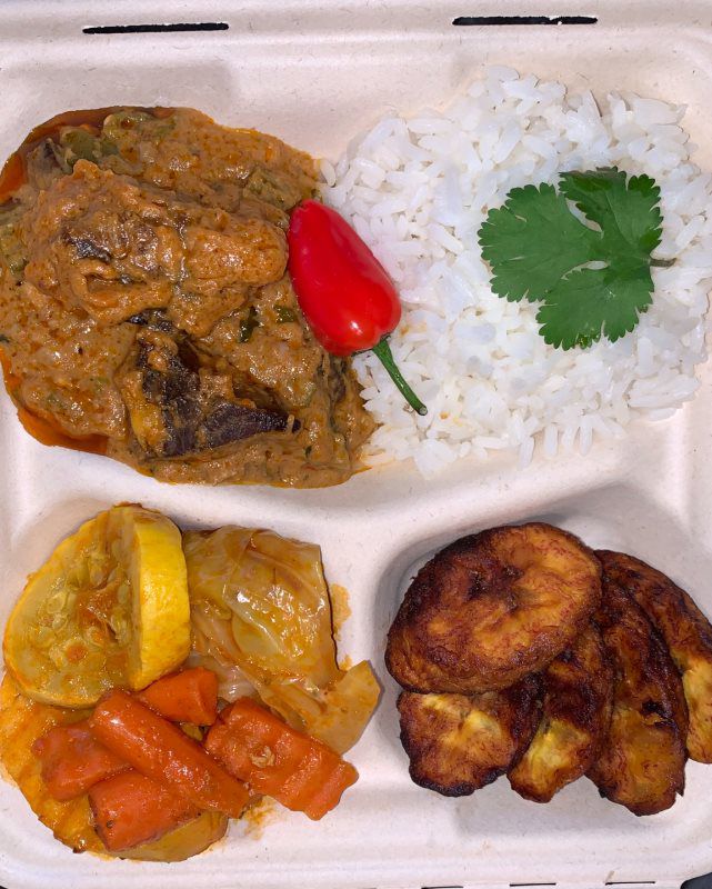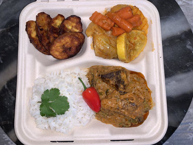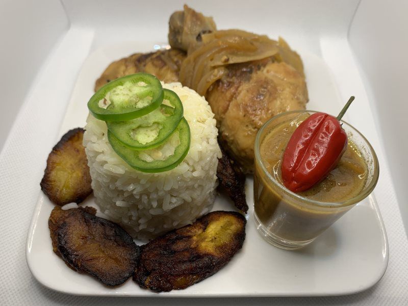 Marinated & Roasted Chicken Legs/Thighs Cooked with Onions & Spices in a Tangy Lemon Sauce. Served with White Rice & Fried Plantains.