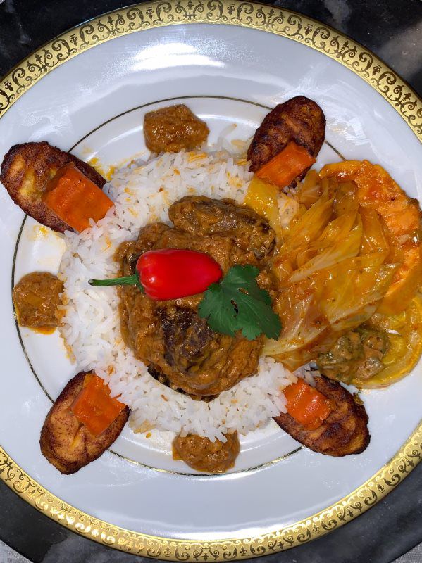 Chunks of Tender Beef Cooked in a Savory Peanut Butter Stew Sauce with Vegetables, served with White Rice